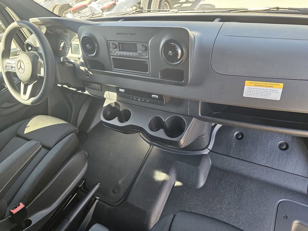Mercedes-Benz prioritized comfort and style by including: 4-Wheel Disc Brakes, 5 Speakers, Air Conditioning, AM/FM radio, Axle Ratio: 4.727, Bodyside moldings, Brake assist, Driver door bin, Driver's Seat Mounted Armrest, Dual front impact airbags, Dual front side impact airbags, Dual rear wheels, Electronic Stability Control, Emergency communication system: eCall Emergency System, Front anti-roll bar, Front Bucket Seats, Front wheel independent suspension, Fully automatic headlights, Heated door mirrors, Illuminated entry, Maturin Fabric Upholstery, Occupant sensing airbag, Outside temperature display, Overhead airbag, Overhead console, Passenger door bin, Passenger seat mounted armrest, Power door mirrors, Power steering, Power windows, Radio: Standard, Rear anti-roll bar, Remote keyless entry, Speed Assist, Sport Brake system with "Mercedes-Benz" lettering, Standard Driver Seat, Standard Front Passenger Seat, Steering wheel mounted audio controls, Tachometer, Tilt steering wheel, Traction control, and Wheels: 5.5J x 16 Steel.