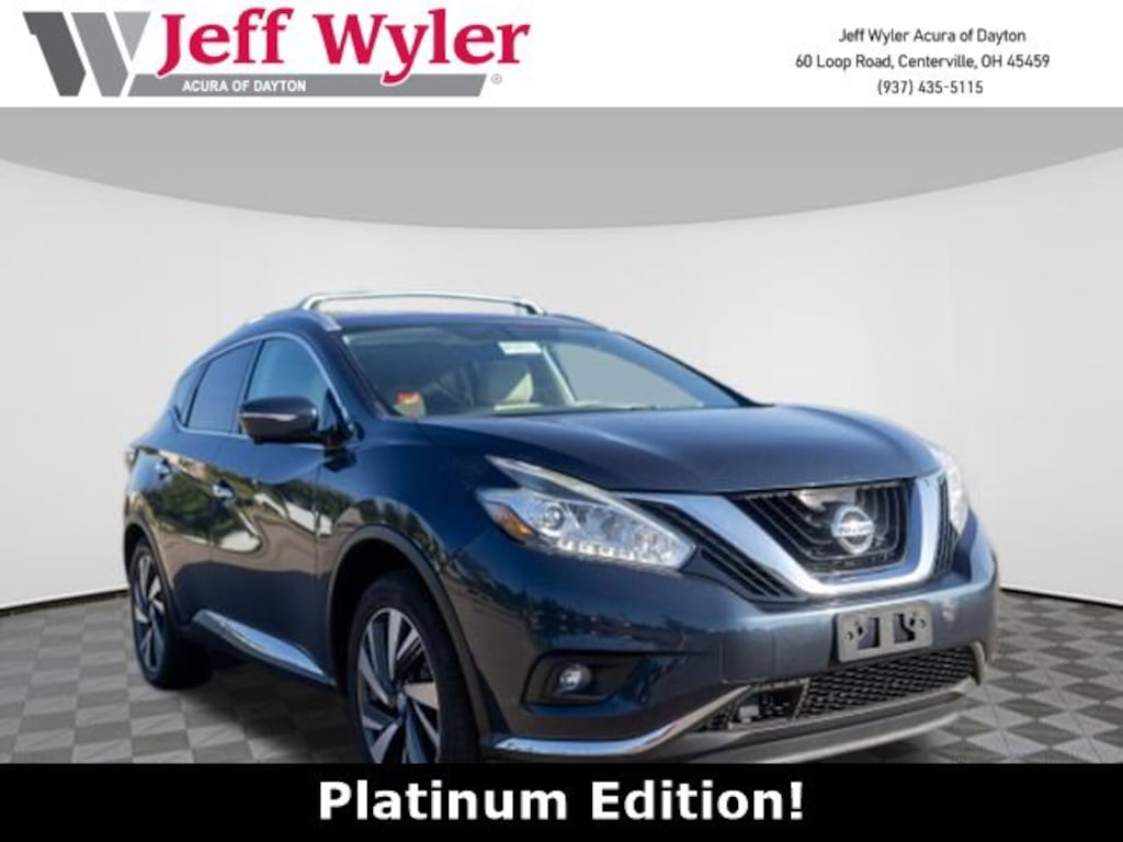 Jeff Wyler Acura of Dayton is pleased to offer this fantastic-looking 2015 Nissan Murano Platinum in Arctic Blue Metallic. Platinum Technology Package (Intelligent Cruise Control and Predictive Forward Collision Warning (PFCW)), CVT with Xtronic, 11 Speakers, 4-Wheel Disc Brakes, 4.677 Axle Ratio, ABS brakes, Activation Disclaimer, Air Conditioning, Alloy wheels, AM/FM radio, Anti-whiplash front head restraints, Auto-dimming Rear-View mirror, Automatic temperature control, Brake assist, Bumpers: body-color, CD player, Compass, Delay-off headlights, Driver door bin, Driver vanity mirror, Dual front impact airbags, Dual front side impact airbags, Electronic Stability Control, Floor Mats & Cargo Area Protector, Four wheel independent suspension, Front anti-roll bar, Front Bucket Seats, Front Center Armrest w/Storage, Front dual zone A/C, Front fog lights, Front reading lights, Fully automatic headlights, Garage door transmitter: HomeLink, Heated & Cooled Front Bucket Seats, Heated door mirrors, Heated front seats, Heated rear seats, Heated steering wheel, Illuminated entry, Knee airbag, Leather Appointed Seat Trim, Leather Shift Knob, Low tire pressure warning, Memory seat, Navigation System, Occupant sensing airbag, Outside temperature display, Overhead airbag, Overhead console, Panic alarm, Passenger door bin, Passenger vanity mirror, Power door mirrors, Power driver seat, Power Liftgate, Power passenger seat, Power steering, Power windows, Radio data system, Radio: AM/FM/CD Audio System w/Navigation, Rear anti-roll bar, Rear reading lights, Rear seat center armrest, Rear window defroster, Rear window wiper, Remote keyless entry, Roof rack: rails only, Security system, Speed control, Speed-sensing steering, Speed-Sensitive Wipers, Split folding rear seat, Spoiler, Steering wheel memory, Steering wheel mounted audio controls, Tachometer, Telescoping steering wheel, Tilt steering wheel, Traction control, Trip computer, Turn signal indicator mirrors, Variably intermittent wipers, Ventilated front seats, and Wheels: 20" Machined Aluminum-Alloy Our PRE-OWNED vehicles are put through a rigorous 167- POINT QUALITY ASSURANCE INSPECTION along with an average amount of over $1,400.00 SPENT to recondition each vehicle so we can be sure to deliver you the highest quality vehicle like you deserve! ***ONLINE PRICE DOES NOT INCLUDE WYLER FAMILY FIRST PACKAGE*** Stop by 4136 Shelbyville Road to see for yourself, or give us a call @ 502-897-3151 to schedule your test drive!