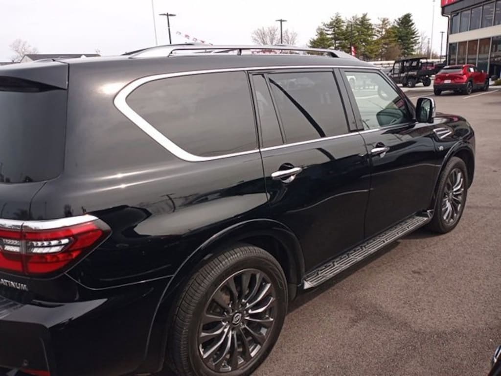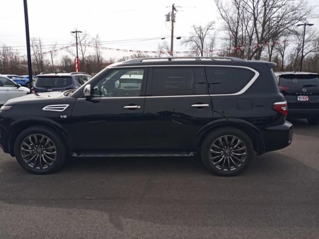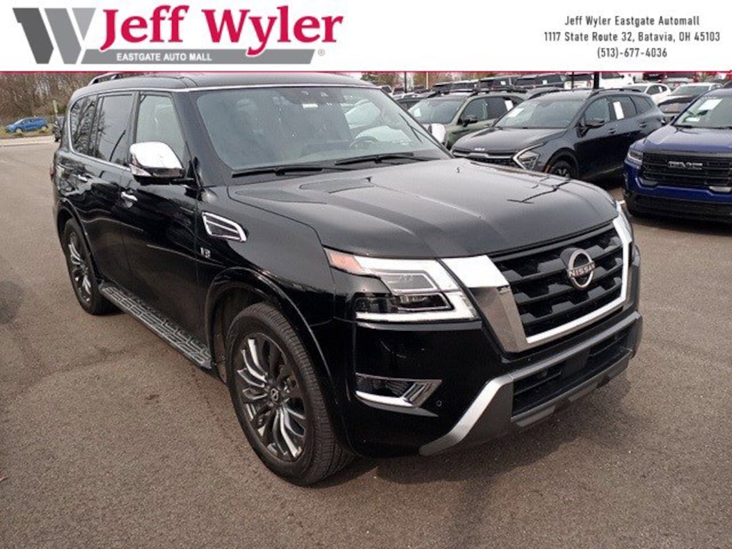 Jeff Wyler Eastgate Auto Mall is excited to offer this charming 2021 Nissan Armada Platinum in Super Black. Well equipped with: 13 Speakers, 2.94 Axle Ratio, 3rd Row Carpeted Floor Mats - Bench Seat, 3rd row seats: split-bench, 4-Wheel Disc Brakes, A/V remote, ABS brakes, Air Conditioning, Alloy wheels, AM/FM radio: SiriusXM, Anti-whiplash front head restraints, Auto High-beam Headlights, Auto tilt-away steering wheel, Auto-dimming door mirrors, Auto-dimming Rear-View mirror, Auto-leveling suspension, Automatic temperature control, Brake assist, Bumpers: body-color, Climate-Controlled Front Bucket Seats, Cross Bars, Delay-off headlights, Driver door bin, Driver vanity mirror, Dual front impact airbags, Dual front side impact airbags, Electronic Stability Control, Emergency communication system: NissanConnect Services, Exterior Parking Camera Rear, Four wheel independent suspension, Front anti-roll bar, Front Bucket Seats, Front Center Armrest, Front dual zone A/C, Front fog lights, Front reading lights, Fully automatic headlights, Garage door transmitter: HomeLink, Headphones, Heated door mirrors, Heated front seats, Heated rear seats, Heated steering wheel, Illuminated entry, Leather Shift Knob, Low tire pressure warning, Memory seat, Navigation System, NissanConnect featuring Apple CarPlay and Android Auto, Occupant sensing airbag, Outside temperature display, Overhead airbag, Overhead console, Panic alarm, Passenger door bin, Passenger vanity mirror, Power door mirrors, Power driver seat, Power Liftgate, Power moonroof, Power passenger seat, Power steering, Power windows, Quilted Leather Seat Trim, Radio: NissanConnect w/SiriusXM, Rain sensing wipers, Rear air conditioning, Rear anti-roll bar, Rear reading lights, Rear seat center armrest, Rear window defroster, Rear window wiper, Reclining 3rd row seat, Remote keyless entry, Security system, Speed control, Speed-sensing steering, Speed-Sensitive Wipers, Split folding rear seat, Spoiler, Steering wheel memory, Steering wheel mounted audio controls, Tachometer, Telescoping steering wheel, Tilt steering wheel, Traction control, Trip computer, Turn signal indicator mirrors, Variably intermittent wipers, Ventilated front seats, Voltmeter, and Wheels: 22" Machine-Faced w/Tinted Clear Coat. Clean CARFAX. Ask about available certifications. Used vehicles 10 years of age or newer with less than 100,000 miles are eligible for the Wyler Assurance Program, but eligible vehicles must pass our reconditioning process and multi-point inspection. Provided the vehicle passes inspection, vehicles will be eligible for the 6 month/6,000 mile limited warranty. The 6 month/6,000 mile limited warranty is NOT available on AS-IS vehicles, wholesale vehicles, lease buyback/pass-thru vehicles or un-inspected vehicles. Note that this program can also apply to vehicles where the remaining factory coverage is less than 6 months or 6,000 miles. Please check the Federal Trade Commission (FTC) Buyers guide on the vehicle for full details as to whether or not warranty coverage may apply. Contact Dealer for additional details. The Wyler Assurance 6 month/6,000 Mile limited warranty ends 6 months from the date of the Retail Purchase Agreement (BUYERS ORDER) or when the vehicle's odometer registers 6,000 additional miles to the mileage listed on the BUYERS ORDER, whichever comes first. Your Deductible - The warranty holder on your contract pays the first $100 of each covered repair.