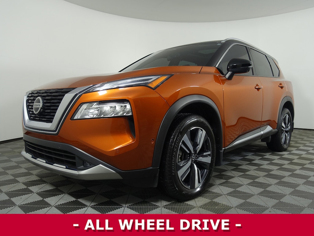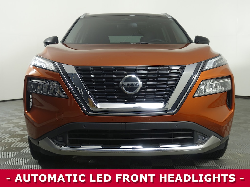 The 2021 Nissan Rogue Platinum is a compact SUV that combines style, comfort, and advanced technology. It features a bold exterior design with a V-motion grille, sleek LED headlamps, and striking body lines.