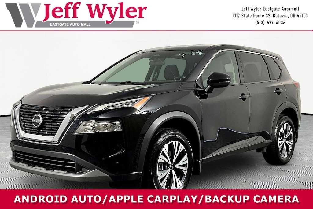 Jeff Wyler Eastgate Auto Mall is pleased to offer this fantastic-looking 2023 Nissan Rogue SV in Super Black. Well equipped with: 18" Aluminum Alloy Wheels, 4-Wheel Disc Brakes, 5.604 Axle Ratio, 6 Speakers, ABS brakes, Air Conditioning, Alloy wheels, AM/FM Radio, AM/FM radio: SiriusXM, Auto High-beam Headlights, Automatic temperature control, Black Splash Guards (Set of 4), Brake assist, Bumpers: body-color, Chrome Rear Bumper Protector, Cloth Seat Trim, Delay-off headlights, Driver door bin, Driver vanity mirror, Dual front impact airbags, Dual front side impact airbags, Electronic Stability Control, Emergency communication system: NissanConnect Services, First Aid Kit, Floor Mats w/1-Piece Cargo Area Protector, Four wheel independent suspension, Front anti-roll bar, Front Bucket Seats, Front Center Armrest, Front dual zone A/C, Front reading lights, Fully automatic headlights, Heated door mirrors, Illuminated entry, Knee airbag, Low tire pressure warning, NissanConnect featuring Apple CarPlay and Android Auto, Occupant sensing airbag, Outside temperature display, Overhead airbag, Overhead console, Panic alarm, Passenger door bin, Passenger vanity mirror, Power door mirrors, Power driver seat, Power steering, Power windows, Radio data system, Rear anti-roll bar, Rear Parking Sensors, Rear seat center armrest, Rear side impact airbag, Rear window defroster, Rear window wiper, Remote keyless entry, Security system, Speed control, Speed-Sensitive Wipers, Split folding rear seat, Spoiler, Steering wheel mounted audio controls, Tachometer, Telescoping steering wheel, Tilt steering wheel, Traction control, Trip computer, Turn signal indicator mirrors, and Variably intermittent wipers. CARFAX One-Owner. Clean CARFAX. Ask about available certifications. Used vehicles 10 years of age or newer with less than 100,000 miles are eligible for the Wyler Assurance Program, but eligible vehicles must pass our reconditioning process and multi-point inspection. Provided the vehicle passes inspection, vehicles will be eligible for the 6 month/6,000 mile limited warranty. The 6 month/6,000 mile limited warranty is NOT available on AS-IS vehicles, wholesale vehicles, lease buyback/pass-thru vehicles or un-inspected vehicles. Note that this program can also apply to vehicles where the remaining factory coverage is less than 6 months or 6,000 miles. Please check the Federal Trade Commission (FTC) Buyers guide on the vehicle for full details as to whether or not warranty coverage may apply. Contact Dealer for additional details. The Wyler Assurance 6 month/6,000 Mile limited warranty ends 6 months from the date of the Retail Purchase Agreement (BUYERS ORDER) or when the vehicle's odometer registers 6,000 additional miles to the mileage listed on the BUYERS ORDER, whichever comes first. Your Deductible - The warranty holder on your contract pays the first $100 of each covered repair.