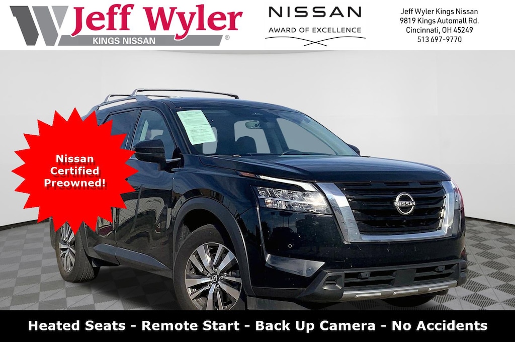 Jeff Wyler Kings Nissan is pumped up to offer this charming 2024 Nissan Pathfinder SL in Super Black. Well equipped with: 4WD, 3rd row seats: bench, 4-Wheel Disc Brakes, 6 Speakers, ABS brakes, Air Conditioning, Alloy wheels, AM/FM radio: SiriusXM, Auto High-beam Headlights, Auto-dimming Rear-View mirror, Automatic temperature control, Axle Ratio: 4.334, Bench Seat Carpeted Floor Mats (Set of 4), Black Splash Guards (Set of 4), Brake assist, Bumpers: body-color, Cross Bars, Delay-off headlights, Driver door bin, Driver vanity mirror, Dual front impact airbags, Dual front side impact airbags, Electronic Stability Control, Emergency communication system, Exterior Parking Camera Rear, Four wheel independent suspension, Front anti-roll bar, Front Bucket Seats, Front Center Armrest, Front dual zone A/C, Front reading lights, Fully automatic headlights, Garage door transmitter: HomeLink, Heated door mirrors, Heated Front Bucket Seats, Heated front seats, Heated steering wheel, Illuminated entry, Knee airbag, Leather steering wheel, Leather-Appointed Seating Surfaces, Low tire pressure warning, Navigation system: NissanConnect with Navigation and Services, NissanConnect featuring Apple CarPlay and Android Auto, NissanConnect w/Navigation & Services, Occupant sensing airbag, Outside temperature display, Overhead airbag, Overhead console, Panic alarm, Passenger door bin, Passenger vanity mirror, Power door mirrors, Power driver seat, Power Liftgate, Power passenger seat, Power steering, Power windows, Radio data system, Radio: AM/FM Audio System, Rear air conditioning, Rear anti-roll bar, Rear reading lights, Rear seat center armrest, Rear side impact airbag, Rear window defroster, Rear window wiper, Reclining 3rd row seat, Remote keyless entry, Security system, Speed control, Speed-sensing steering, Split folding rear seat, Spoiler, Steering wheel mounted audio controls, Tachometer, Telescoping steering wheel, Tilt steering wheel, Traction control, Trip computer, Turn signal indicator mirrors, Variably intermittent wipers, and Wheels: 18" x 8J Machined Alloy.Ask about available certifications.