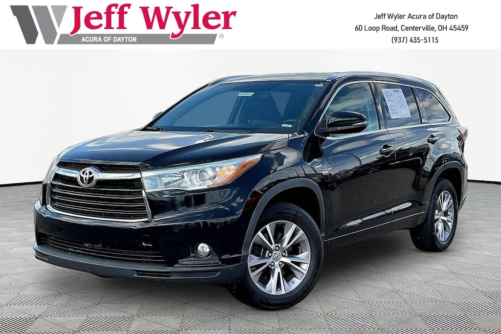 Jeff Wyler Acura of Dayton is excited to offer this superb 2015 Toyota Highlander XLE V6 in Attitude Black Metallic. 3rd row seats: split-bench, 4-Wheel Disc Brakes, 4.154 Axle Ratio, 6 Speakers, ABS brakes, Air Conditioning, Alloy wheels, AM/FM radio: SiriusXM, Anti-whiplash front head restraints, Auto-dimming Rear-View mirror, Automatic temperature control, Brake assist, Bumpers: body-color, CD player, Delay-off headlights, Driver door bin, Driver vanity mirror, Dual front impact airbags, Dual front side impact airbags, Electronic Stability Control, Exterior Parking Camera Rear, Four wheel independent suspension, Front anti-roll bar, Front Bucket Seats, Front Center Armrest, Front dual zone A/C, Front fog lights, Front reading lights, Fully automatic headlights, Garage door transmitter, Heated door mirrors, Heated front seats, Illuminated entry, Knee airbag, Leather Seat Material, Leather Shift Knob, Low tire pressure warning, Navigation System, Occupant sensing airbag, Outside temperature display, Overhead airbag, Overhead console, Panic alarm, Passenger door bin, Passenger vanity mirror, Power door mirrors, Power driver seat, Power Liftgate, Power moonroof, Power steering, Power windows, Radio: Entune Premium Audio w/Nav & App Suite, Rear air conditioning, Rear anti-roll bar, Rear reading lights, Rear window defroster, Rear window wiper, Reclining 3rd row seat, Remote keyless entry, Roof rack: rails only, Security system, Speed control, Speed-sensing steering, Split folding rear seat, Spoiler, Steering wheel mounted audio controls, Tachometer, Telescoping steering wheel, Tilt steering wheel, Traction control, Trip computer, Turn signal indicator mirrors, Variably intermittent wipers, and Wheels: 18" Split 5-Spoke Machined-Face Alloy Our PRE-OWNED vehicles are put through a rigorous 167- POINT QUALITY ASSURANCE INSPECTION along with an average amount of over $1,400.00 SPENT to recondition each vehicle so we can be sure to deliver you the highest quality vehicle like you deserve! ***ONLINE PRICE DOES NOT INCLUDE WYLER FAMILY FIRST PACKAGE***