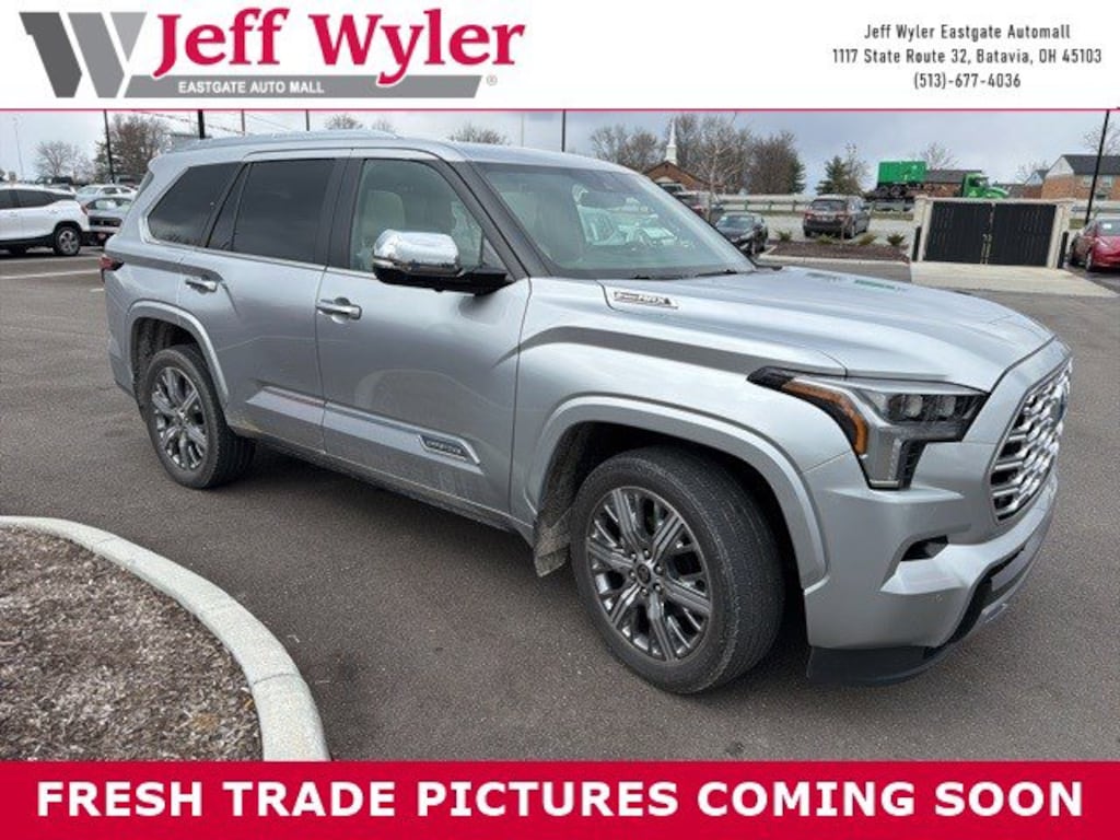 Jeff Wyler Eastgate Auto Mall is delighted to offer this good-looking 2024 Toyota Sequoia in Silver. Well equipped with: 3.31 Axle Ratio, 3rd row seats: split-bench, 4-Wheel Disc Brakes, ABS brakes, Air Conditioning, Alloy wheels, AM/FM radio: SiriusXM, Anti-whiplash front head restraints, Apple CarPlay/Android Auto, Auto High-beam Headlights, Auto-dimming door mirrors, Auto-dimming Rear-View mirror, Automatic temperature control, Brake assist, Bumpers: body-color, Delay-off headlights, Driver door bin, Driver vanity mirror, Dual front impact airbags, Dual front side impact airbags, Electronic Stability Control, Emergency communication system: Safety Connect (10-year trial), Exterior Parking Camera Rear, Front anti-roll bar, Front Bucket Seats, Front Center Armrest w/Storage, Front dual zone A/C, Front fog lights, Front reading lights, Front wheel independent suspension, Fully automatic headlights, Headlight cleaning, Heated door mirrors, Heated front seats, Illuminated entry, Knee airbag, Leather steering wheel, Low tire pressure warning, Occupant sensing airbag, Outside temperature display, Overhead airbag, Overhead console, Panic alarm, Passenger door bin, Passenger vanity mirror, Power door mirrors, Power driver seat, Power moonroof, Power passenger seat, Power steering, Power windows, Rear air conditioning, Rear reading lights, Rear seat center armrest, Rear window defroster, Rear window wiper, Reclining 3rd row seat, Remote keyless entry, Security system, Speed control, Speed-sensing steering, Split folding rear seat, Spoiler, Steering wheel mounted audio controls, Tachometer, Telescoping steering wheel, Tilt steering wheel, Traction control, Trip computer, Turn signal indicator mirrors, Variably intermittent wipers, and Voltmeter. Ask about available certifications. Used vehicles 10 years of age or newer with less than 100,000 miles are eligible for the Wyler Assurance Program, but eligible vehicles must pass our reconditioning process and multi-point inspection. Provided the vehicle passes inspection, vehicles will be eligible for the 6 month/6,000 mile limited warranty. The 6 month/6,000 mile limited warranty is NOT available on AS-IS vehicles, wholesale vehicles, lease buyback/pass-thru vehicles or un-inspected vehicles. Note that this program can also apply to vehicles where the remaining factory coverage is less than 6 months or 6,000 miles. Please check the Federal Trade Commission (FTC) Buyers guide on the vehicle for full details as to whether or not warranty coverage may apply. Contact Dealer for additional details. The Wyler Assurance 6 month/6,000 Mile limited warranty ends 6 months from the date of the Retail Purchase Agreement (BUYERS ORDER) or when the vehicle's odometer registers 6,000 additional miles to the mileage listed on the BUYERS ORDER, whichever comes first. Your Deductible - The warranty holder on your contract pays the first $100 of each covered repair.